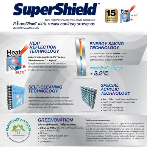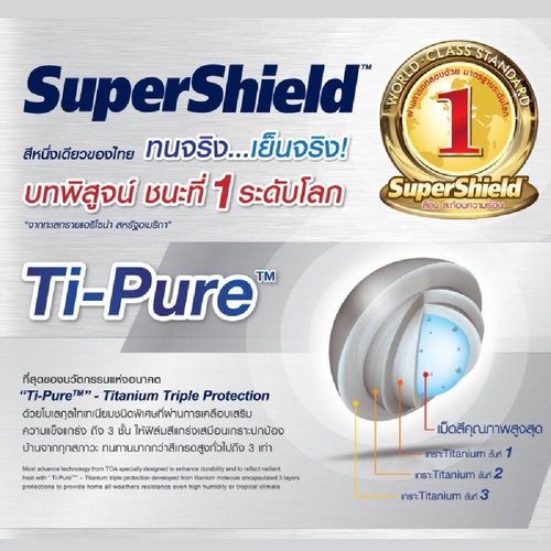 สีน้ำอะคริลิกเกรดอัลตร้าพรีเมียม ยึดเกาะพื้นผิวดีเยี่ยม ป้องกันสีลอกเป็นฝุ่นผง และป้องกันการกัดกร่อนจากมลภาวะเป็นพิษ สามารถทนทานการขัดถู พร้อมคุณสมบัติป้องกันคราบด่างและเกลือ รวมถึงป้องกันเชื้อราและตะไคร่น้ำ ด้วยที่สุดของนวัตกรรมแห่งอนาคต"Ti-Pure" - Titanium Triple Protection โมเลกุลนาโนไทเทเนียมชนิดพิเศษ ผ่านการเคลือบเสริมความแข็งแกร่งถึง 3 ชั้น ฟิล์มแกร่งเสมือนเกราะปกป้องบ้านจากทุกสภาวะ ทนทานมากกว่าสีสูงทั่วไป 3 เท่า