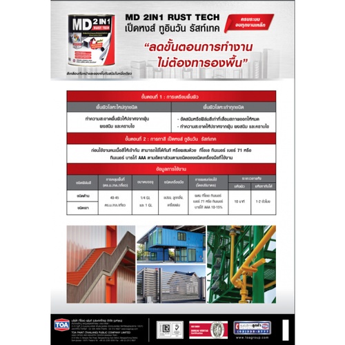 เอ็มดี 2IN1 รัสท์เทค สีเคลือบทับหน้าและรองพื้นกันสนิมในหนึ่งเดียว ด้วยนวัตกรรม Advanced Acrylic Resin สูตรทนทานพิเศษ เพิ่มประสิทธิภาพการยึดเกาะบนพื้นผิวโลหะมันวาวได้อย่างดีเยี่ยม พร้อมคุณสมบัติ แห้งเร็วพิเศษ และปกป้องพื้นผิวจากสนิมโดยไม่ต้องทารองพื้น