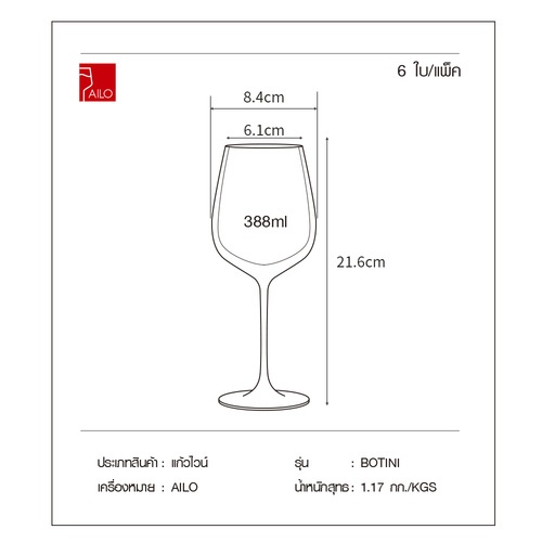 AILO แก้วไวน์ ขนาด 388ml. (6ใบ/แพ็ค) รุ่น BOTINI