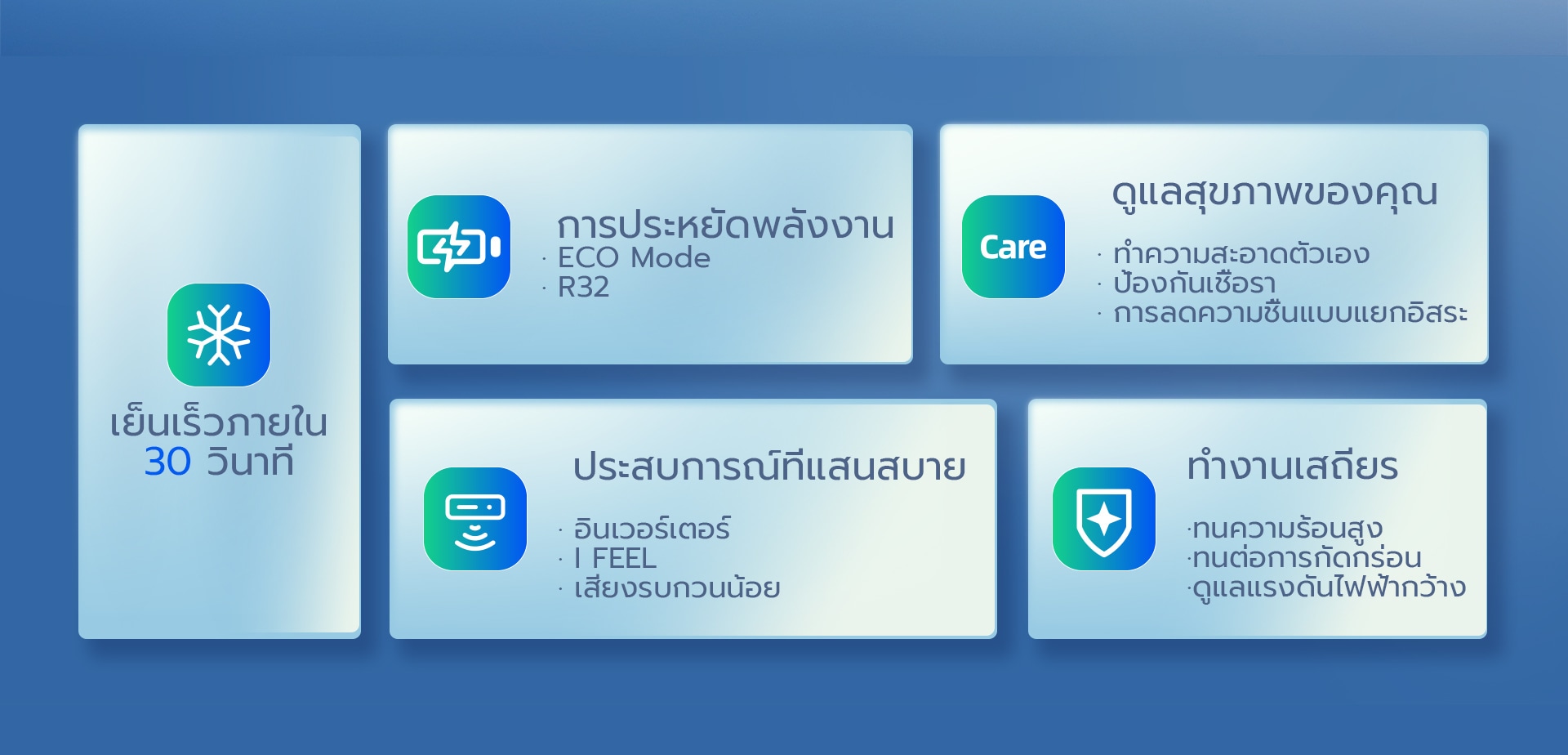 • สารทำความเย็น R32: เป็นมิตรต่อสิ่งแวดล้อมและมีประสิทธิภาพในการทำความเย็นสูง