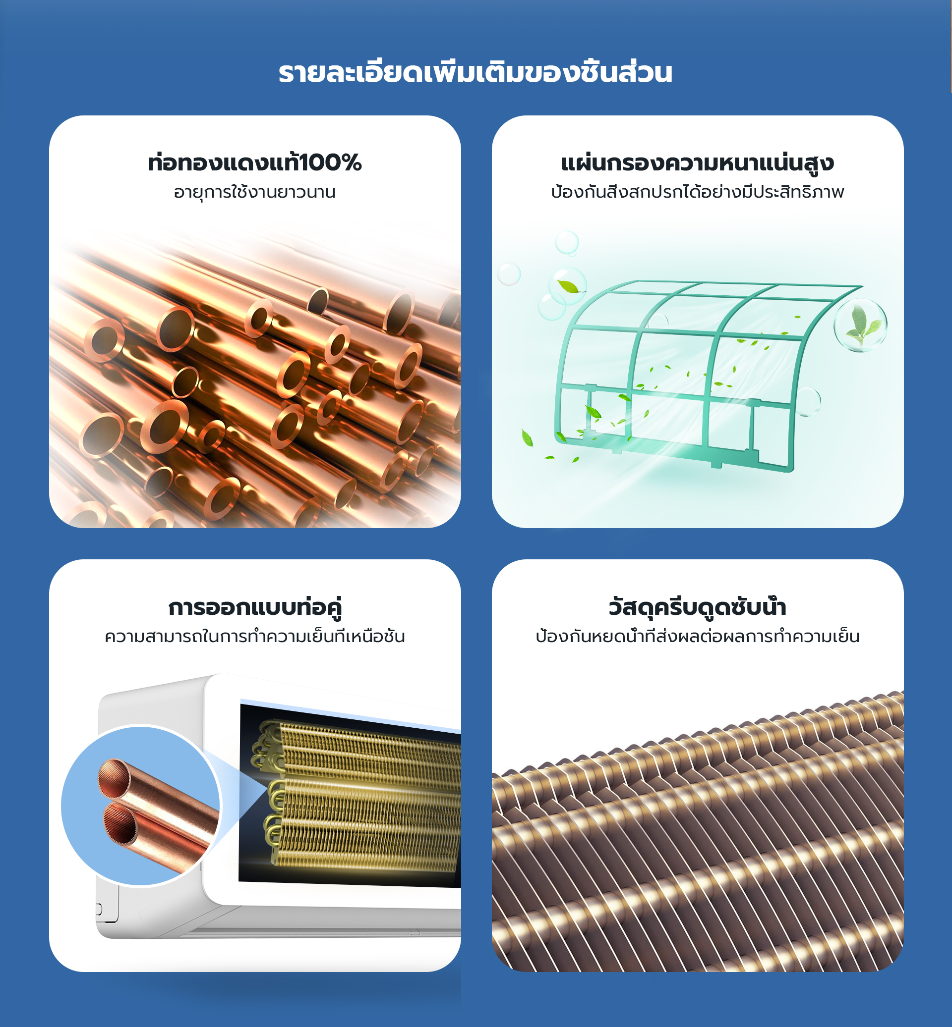 • เทคโนโลยีอินเวอร์เตอร์: ช่วยปรับความเร็วของคอมเพรสเซอร์ให้เหมาะสม ลดการใช้พลังงานและเสียงรบกวน