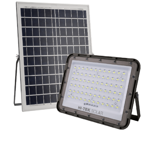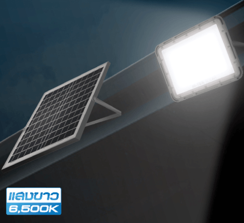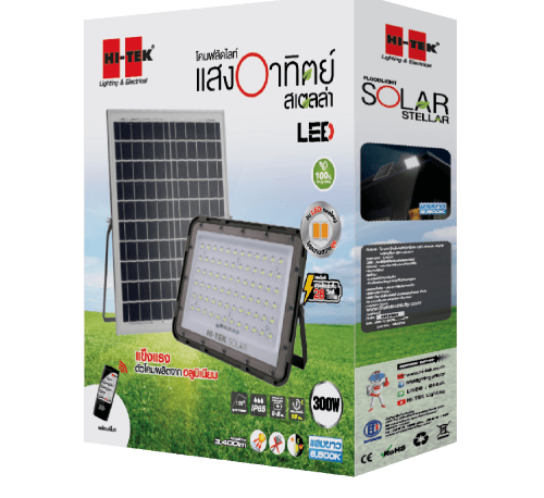 HI-TEK โคมไฟฝลัดไลท์โซล่า LED 300W สีเทา แสงขาว ตัวโคมวัสดุอลูมิเนียม ขาเป็นเหล็ก แข็งแรงทนทาน ชิป LED ความสว่างสูง ออปติคคอลเลนส์ เพิ่มการกระจายของแสงให้สว่างทั่วโคมอย่างมีประสิทธิภาพ ชาร์จไวด้วยแผงรับพลังงานแสงอาทิตย์ : ขนาด 28W สำหรับรุ่น 300W แผงรับพลังงานแสงอทิตย์แบบโพลีคริสตัลไลน์ในกรอบอลูมิเนียม ทนทาน ใช้งานได้ในทุกสภาพอากาศ ระบบเปิดปิดไฟอัตโนมัติโดยแสงอาทิตย์ พร้อมสวิตซ์เปิดปิดการทำงาน มีรึโมทคอนโทรล ควบคุมการเปิดปิด หรี่แสงได้ และตั้งเวลาได้ แบตเตอรี่ชนิดชาร์จได้ ลิเธียมไอออนฟอสเฟตให้พลังงานสูง อายุการใช้งานยาวนาน มีไฟแสดงสถนะระดับพลังงานของแบตเตอรี่ ใช้พลังงานแสงอาทิตย์ 100% ประหยัดค่าไฟ ไม่ต้องจ่ายค่าไฟฟ้า ทนแดด ทนฝน มาตรฐาน IP65 ความสว่าง 3400 lm ติดตั้งเองได้ง่าย ใช้งานกายนอกอาคาร เช่น ที่อยู่อาศัย, ทางเท้า, สวน, ถนน, โรงรถ, สนามหญ้า, ฟาร์ม, เรือ ฯลฯ
