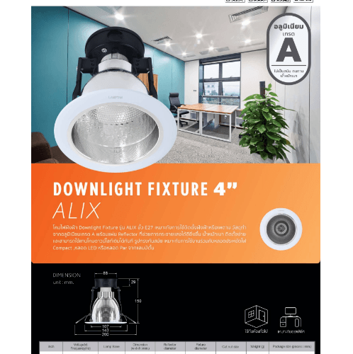LAMPTAN โคมดาวน์ไลท์แบบฝังฝ้าหน้ากลม ขอบขาว 4นิ้ว E27 รุ่นอลิกซ์