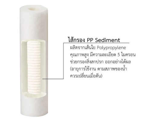 ไส้กรอง Sediment (PP) ไส้กรองชนิดหยาบ มีค่าความละเอียด 5 ไมครอน ทำหน้าที่กรองสิ่งสกปรก ดักจับตะกอน และสารแขวนลอยที่เจือปนอยู่ในน้ำ เปลี่ยนไส้กรองง่ายได้ด้วยตนเอง แบบที่ไม่ต้องใช้เครื่องมือใด