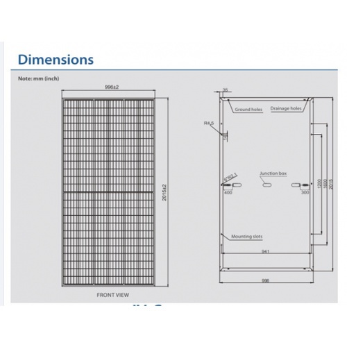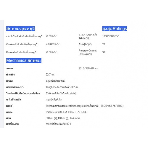 * ไฟฟ้าข้อมูลเกี่ยวข้องกับมาตรฐาน (STC): irradiance 1000W/M2; AM 1.5; เซลล์อุณหภูมิ 25 °C วัด uncertainty of Power ภายใน ± 3%. ได้รับการรับรองตามมาตรฐาน IEC61215, IEC61730-1/2 และ UL 1703
